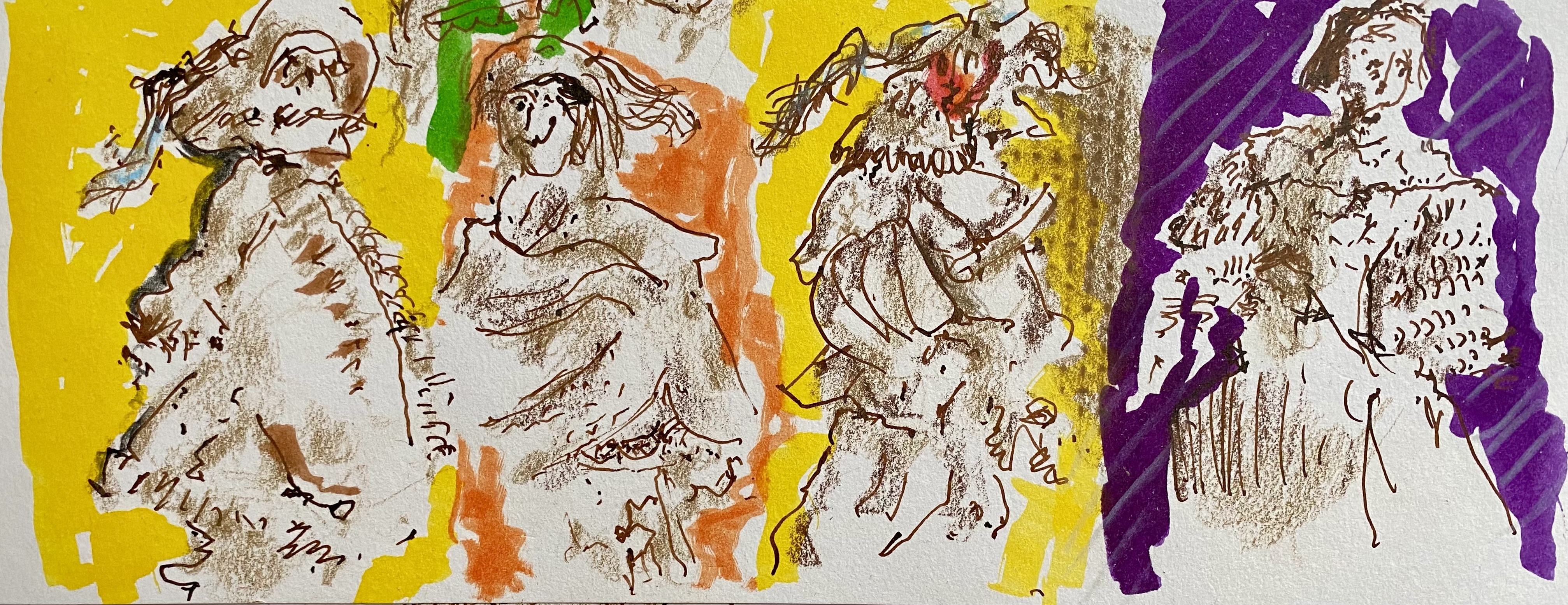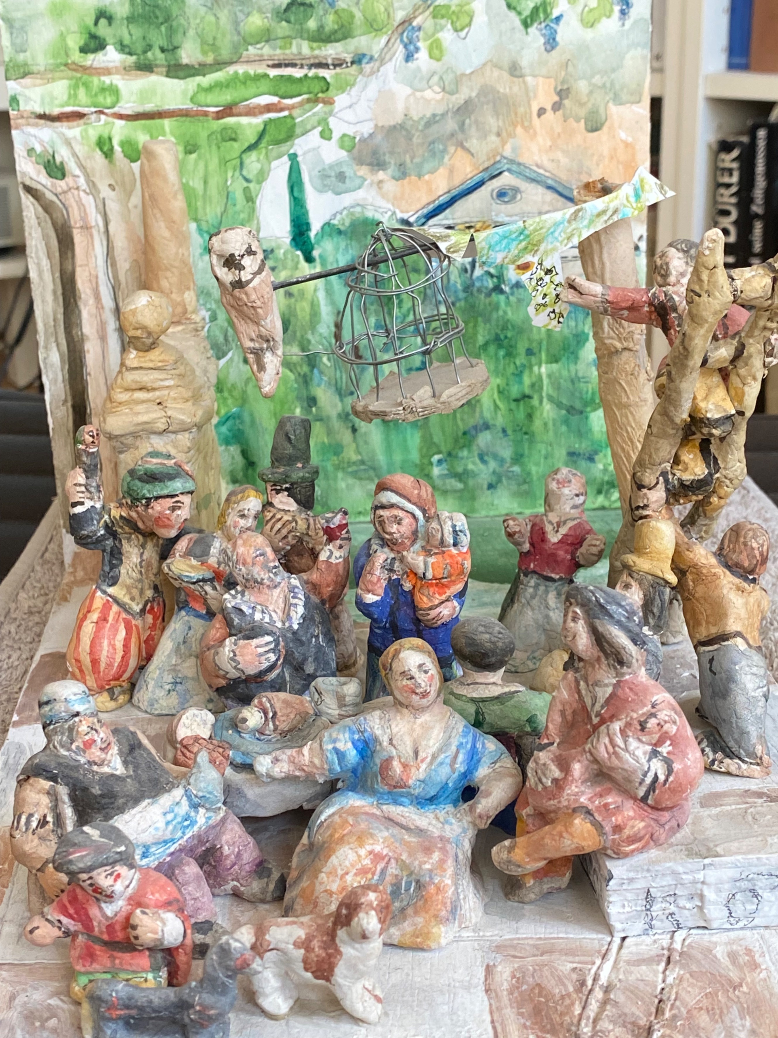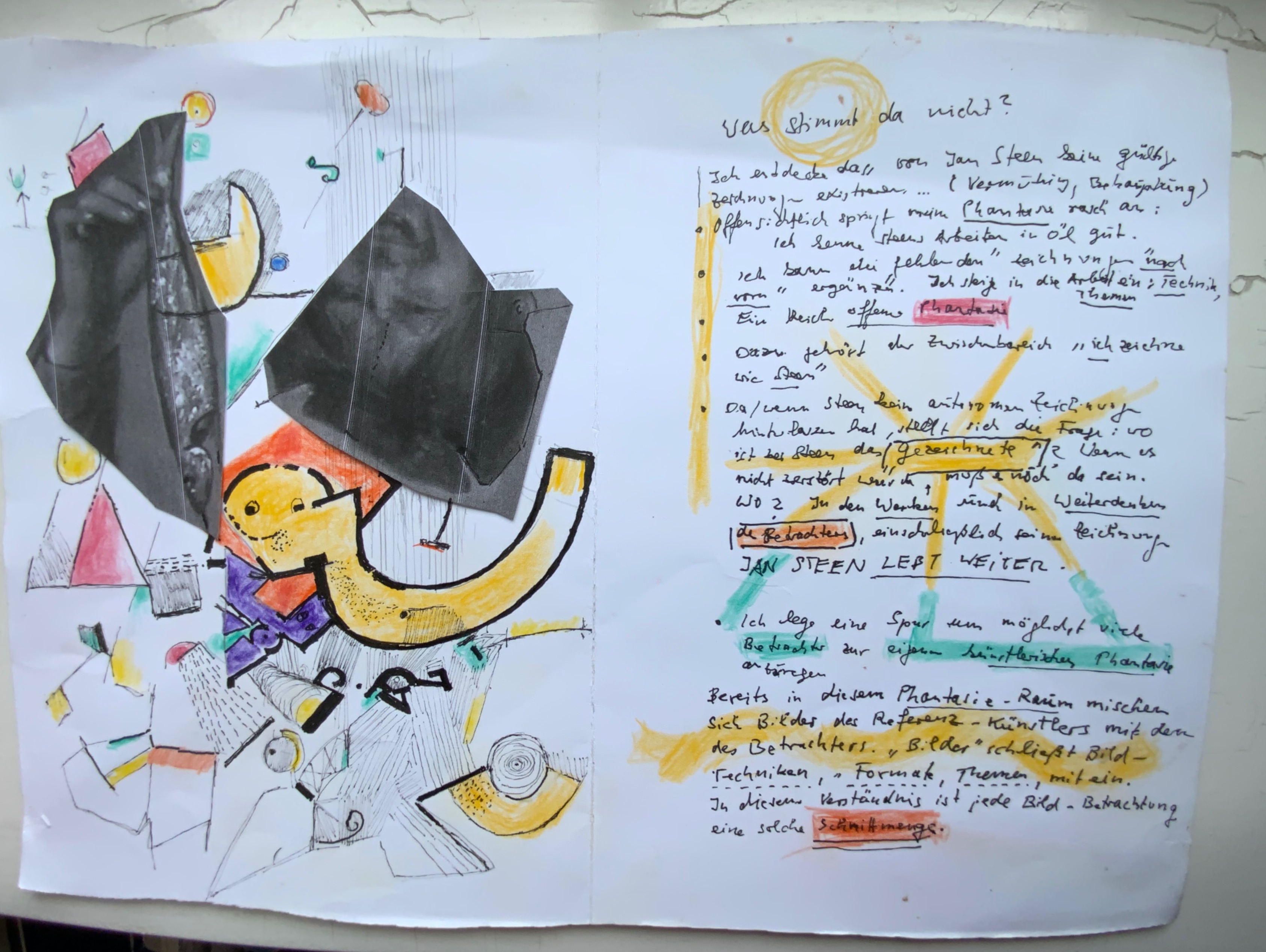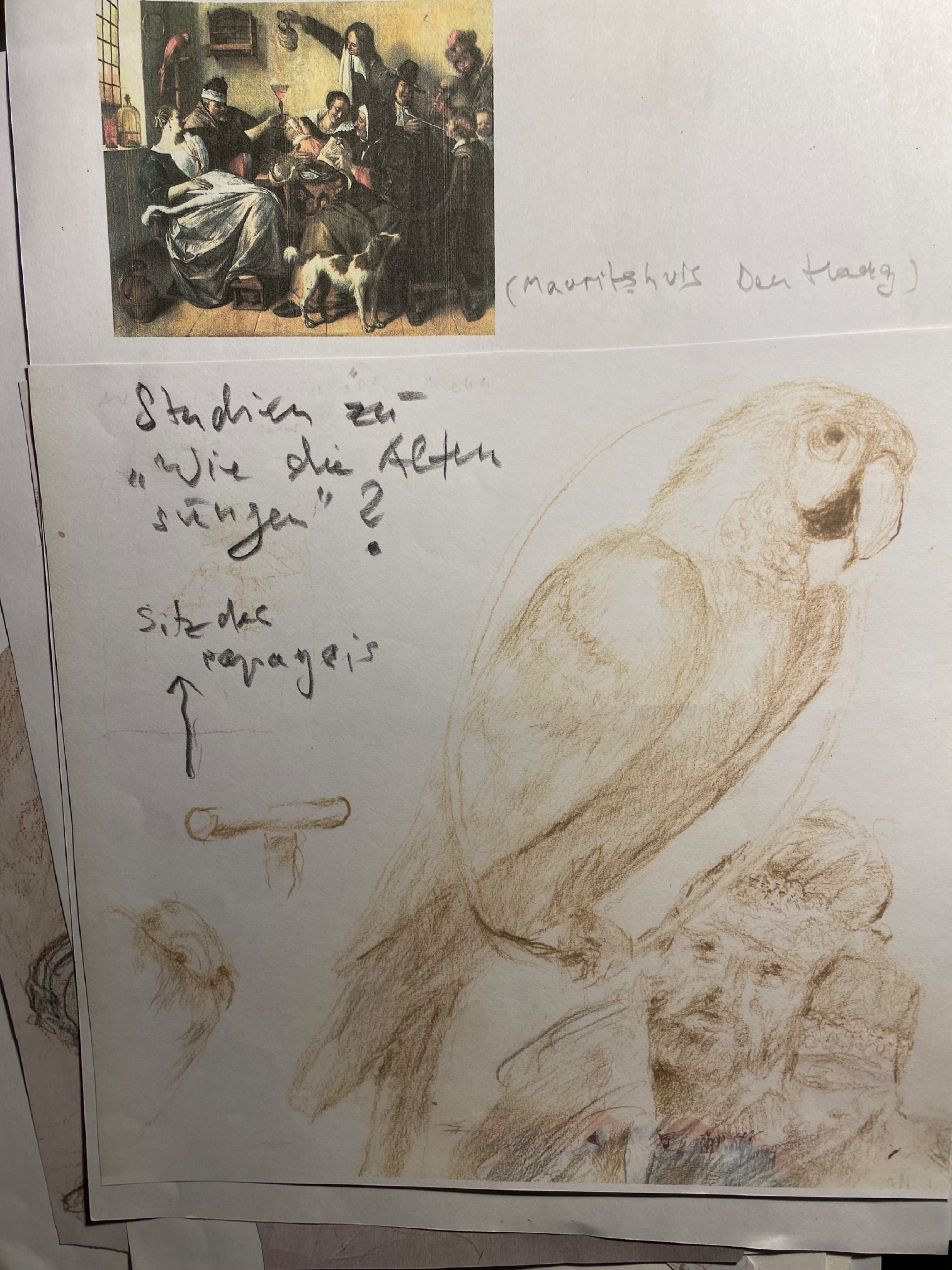Mich traf Steens dramatische Leidenschaft voll. Jede Form des Weiterdenkens endete bei theatralisch animierten Bildern oder Inszenierungen. Als ich die Gelegenehit bekam 1999 die Kunsthalle Tübingen mit den Untersuchungen zum „Wie die Alten sungen, so pfeifen auch die Jungen“(Mauritshuis Den Haag ) zu beleben, habe ich alle Personen des Bildes fast lebensgroß gebaut und auf fahrbare Platten montiert. Die Besucher waren aufgefordert die Szene aufzulösen und neu zu komponieren. Am weitesten bin ich bei der "Abfahrt vom Wirtshaus" (Staatsgalerie Stuttgart) gegangen. Hier entwickelte sich früh die Idee das Stück zu spielen. Ich landete bei Figuren aus Zinkblech, die in einer Version zu Stockpuppen führte, die sich an schwarzen Stöcken befestigt vor dem schwarzen Hintergrund eines Puppentheaters bewegten. Für diese Aufführungen hatte ich ein Stück geschrieben, das seine Dramatik aus dem "Narrenschiff" des Spätmittelalters und den Kardnaltugenden und Lstern entwickelte. So richtig Volumen gewann dieses Stück durch eine Rahmenhandlung, in der Laienschauspieler ,sogen. "Rederijker"das Wirtshaus auf dem Lande als Vereinslokal und Probebühne nutzten Ein grosses Geschenk waren Improvisationen des Giessener Jazz-Saxofonisten und hessischen Landes-Jazzpreisträgers Ekkehart Jost . Eine zweite Version wurde mit wesentlich größerem Aufwand entwickelt. Jetzt waren die Figuren in Aluminiumblech geschnitten und wurden von den Spielern in dunkler Kleidung in einem dunklen Bühnenraum getragen. Text und Musik wurden vorher aufgespielt, so dass alle Konzentration dem Stück gelten konnte. Nach einer Ausstellung in der Kunsthalle Giessen, wanderte die Ausstellung in die Kulturhalle Tübingen. Hier kam es zu einer leider nur einzigen sensationellen Aufführung durch Elke Pfeiffers Tanztheater „Treibholz“ anlässlich der Finissage. Später entwickelte Pfeiffers Truppe daraus "Die sieben Todsünden",